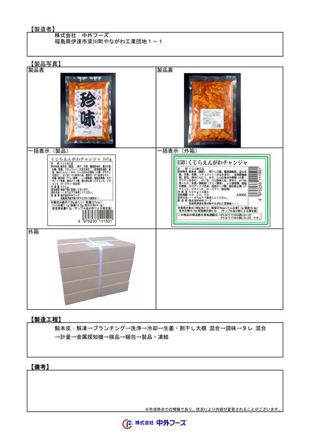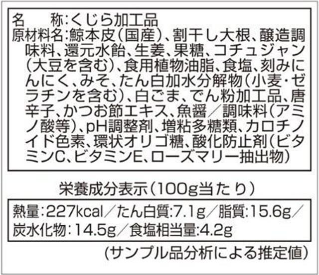 鯨本皮(国産)、割干し大根、醸造調味料、還元水飴、生姜、果糖、コチュジャン(大豆を含む)、食用植物油脂、食塩、刻みにんにく、みそ、たん白加水分解物(小麦・ゼラチンを含む)、白ごま、でん粉加工品、唐辛子、かつお節エキス、魚醤 /調味料(アミノ酸等)、pH調整剤、増粘多糖類、カロチノイド色素、環状オリゴ糖、酸化防止剤(ビタミンC、ビタミンE、ローズマリー抽出物)/b>